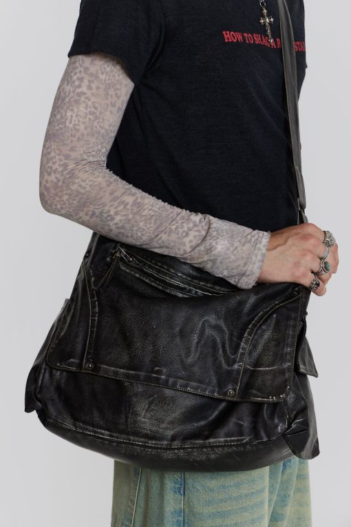 The Ash Messenger Bag is crafted in a black faux leather PU fabric which features antique silver hardware, snap fastening closure and an adjustable wrap around strap.