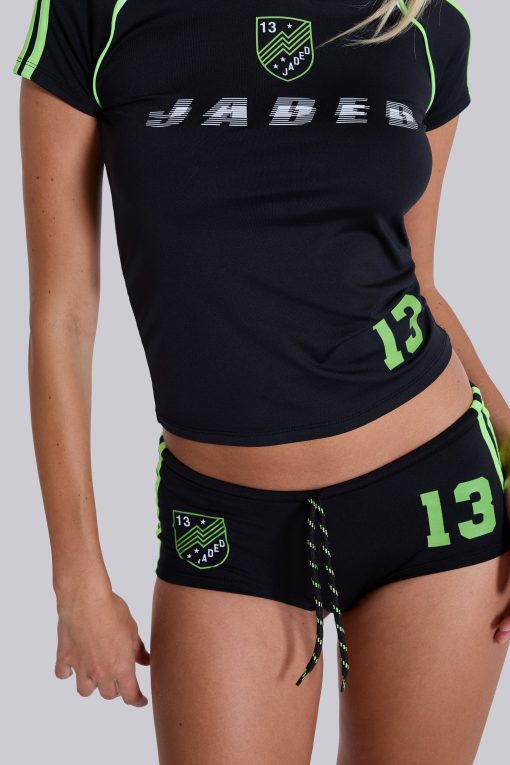 Fitted sporty raglan baby tee with football styling and sleeve stripes.