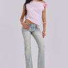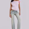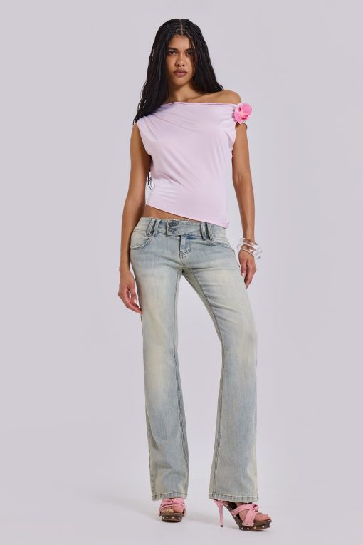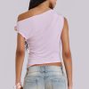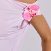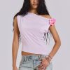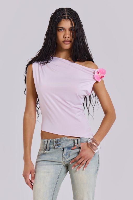 The Dare To Drape In Pink With Flower Detail features an asymmetric design with a raw edge finish. Crafted in a draped slinky jersey fabric, this top has been designed with a gathered shoulder detail.