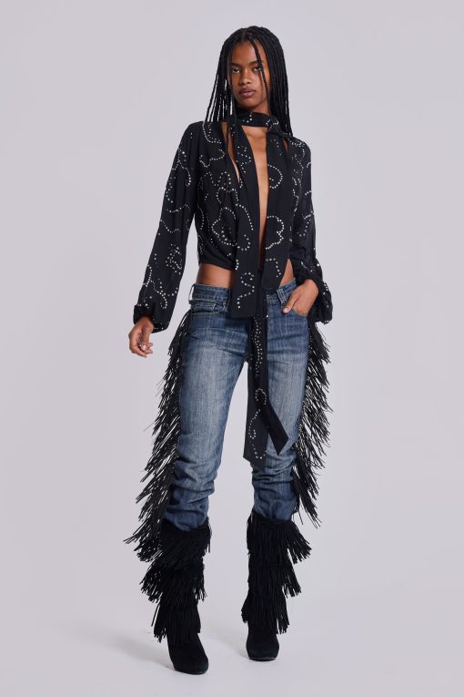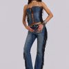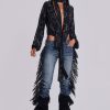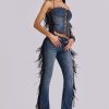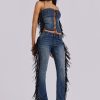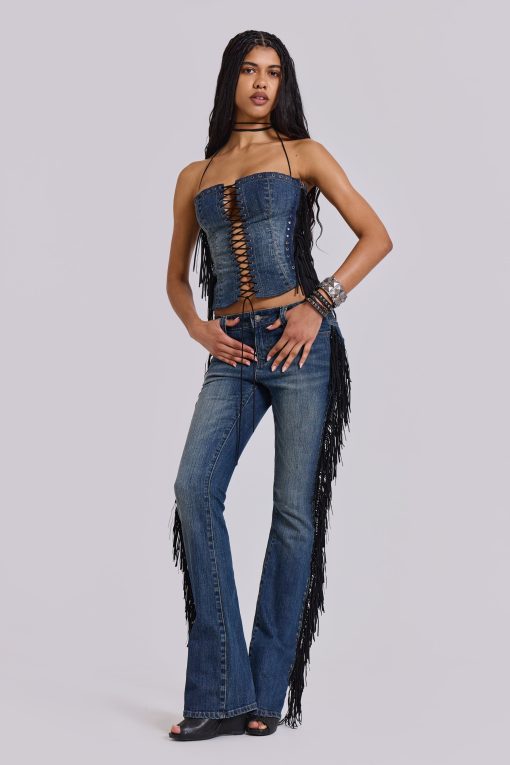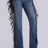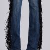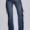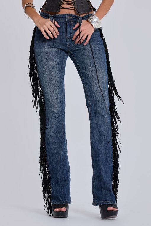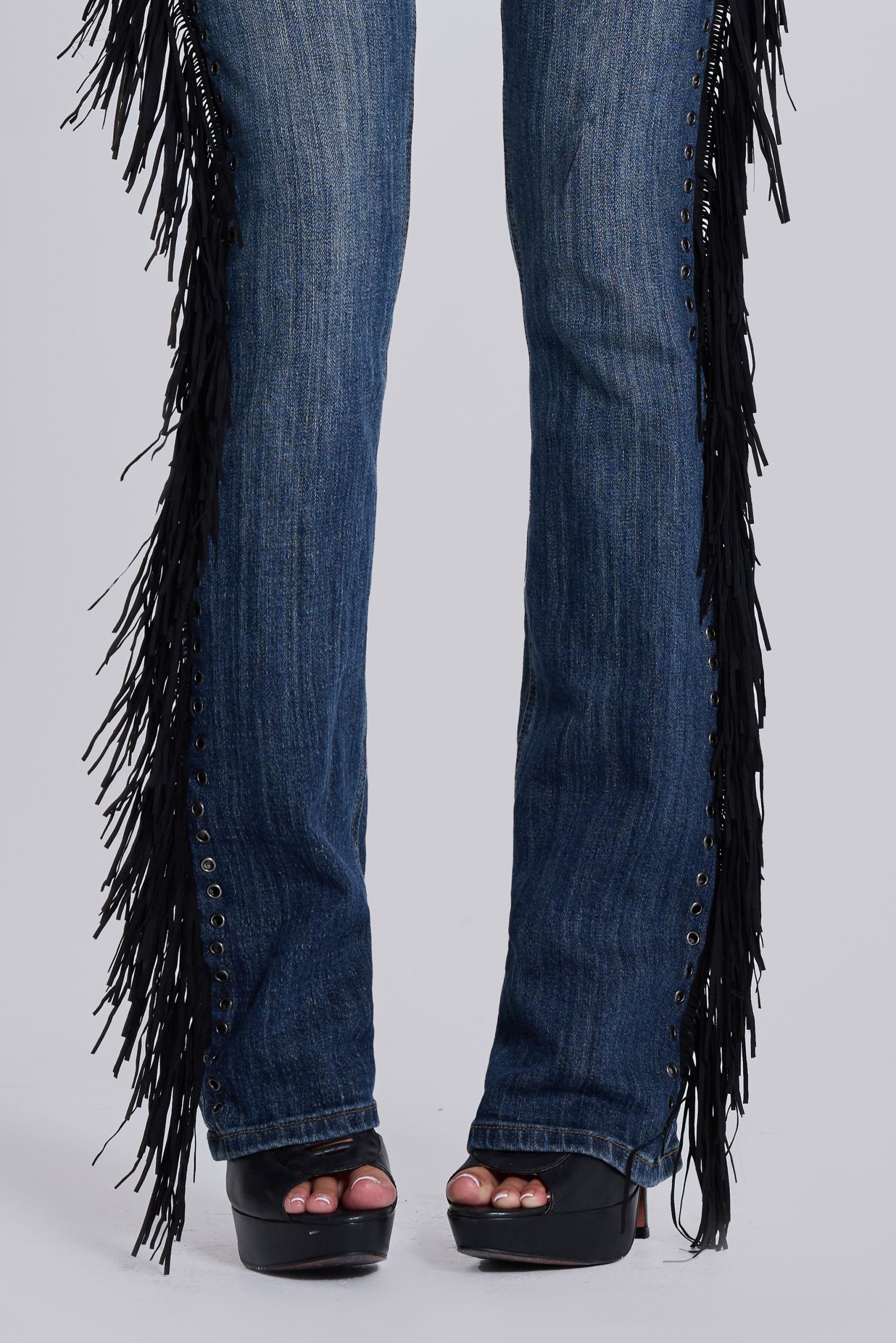 DescriptionDark wash bootcut jean with side seam fringing and eyelet detail.