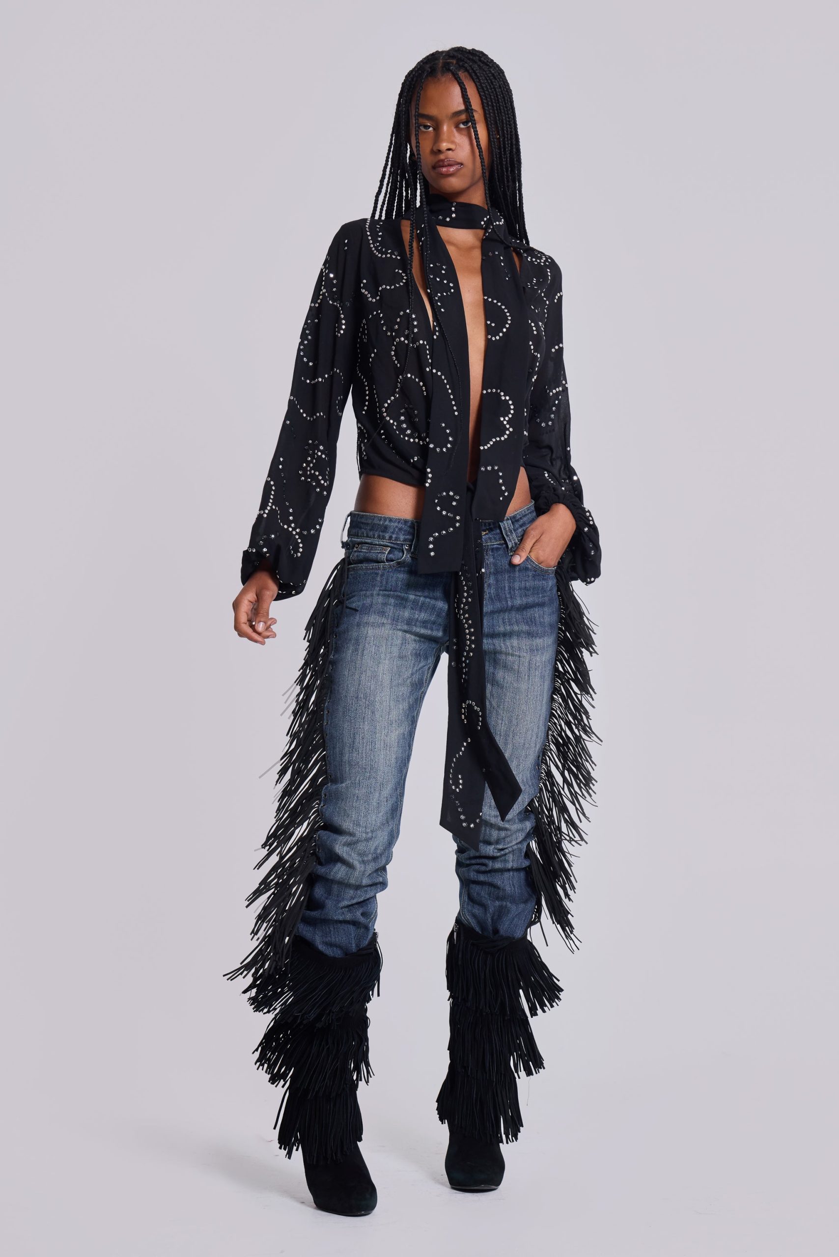 - Faux suede fringing from side seams