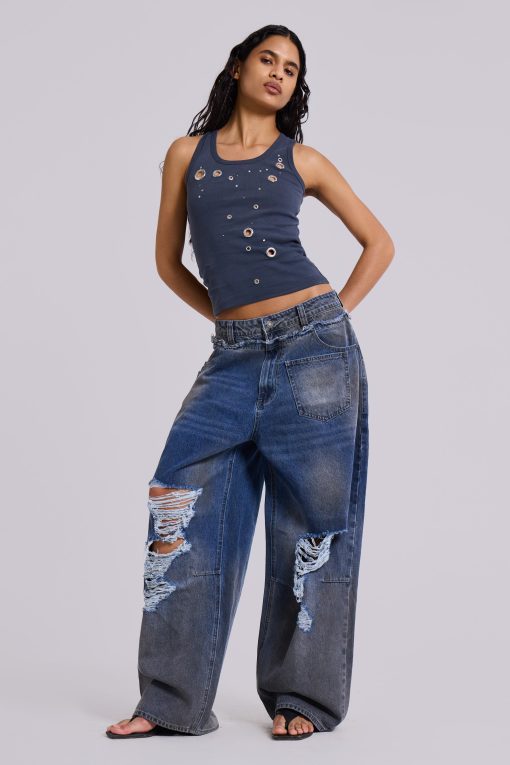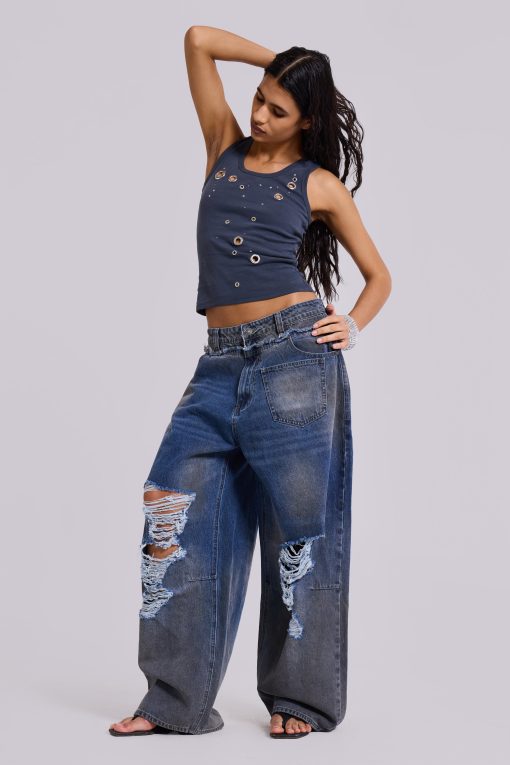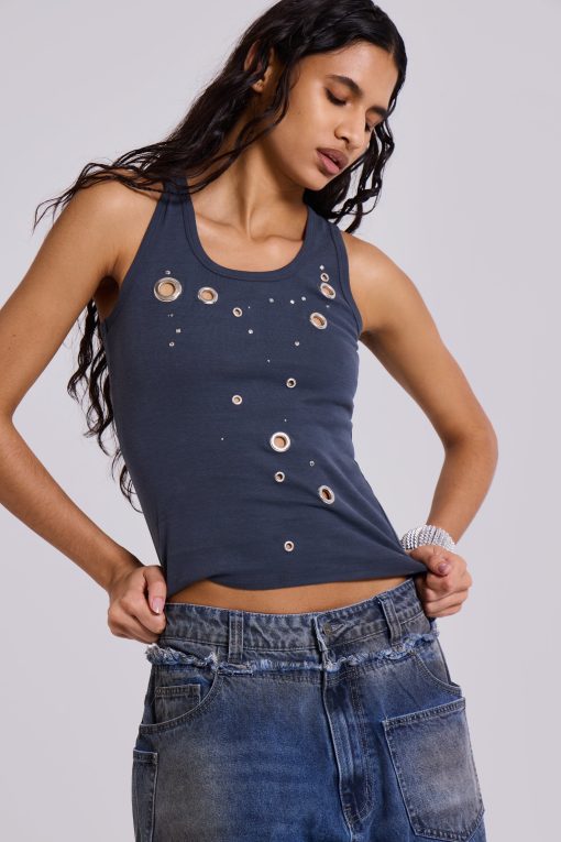 Grey Eye Contact Vest Top With Eyelets. Jersey vest shape with cascading eyelets in varying sizes down front panel.