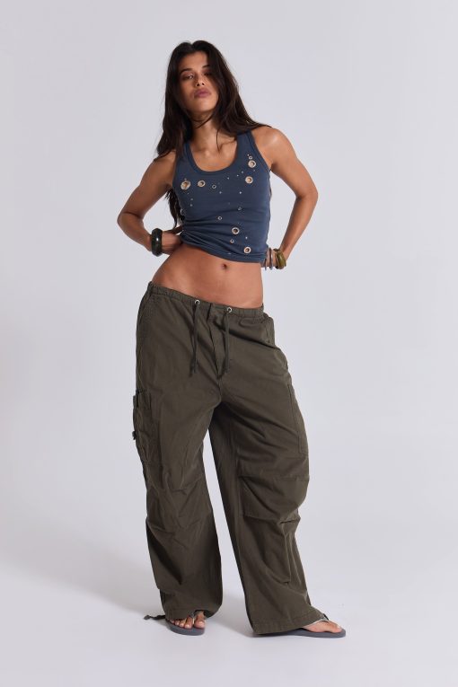 Due to stud trims, take care when wearing. Over time metal trims can tarnish through washing and wear.
