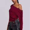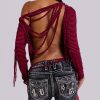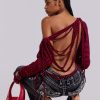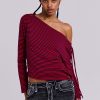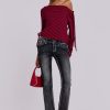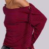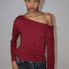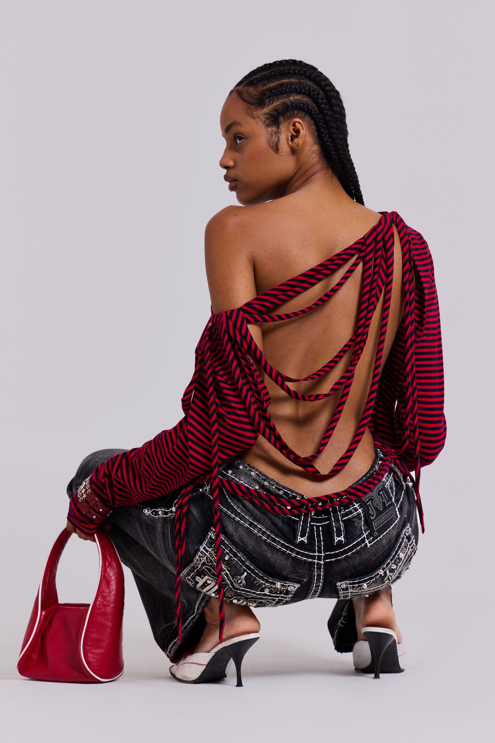 Gaia Slashed Backless Stripe Top. Distressed back jersey top in red and navy micro stripe.