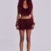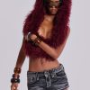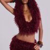 Haka Mongolian Faux Fur Backless Top. Hooded backless plunge Mongolian faux fur top in burgundy. Fastens with PU leather back strap.