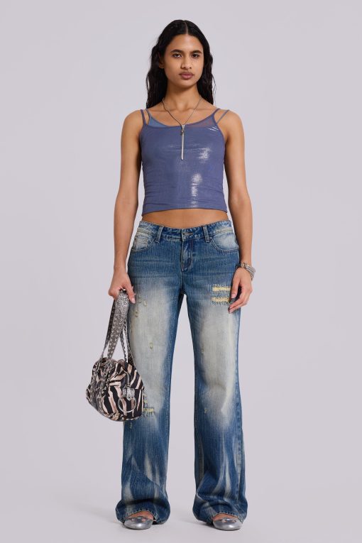Low-rise loose straight leg fit denim jeans in mid blue distressed wash.