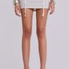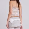 Fabric 1: 65% cotton, 30% polyester, 5% elastane. Fabric 2: 91% polyamide, 9% elastane. Trim: 100% brass