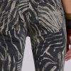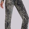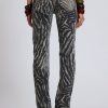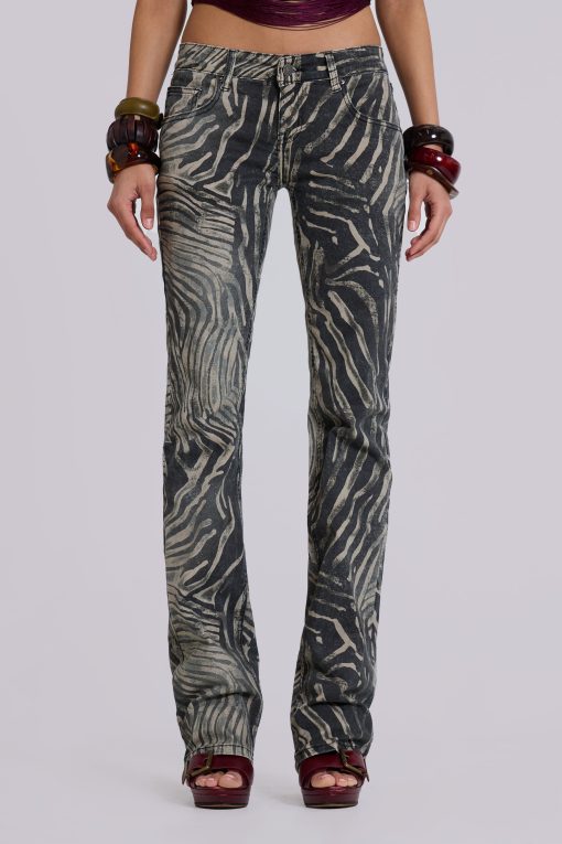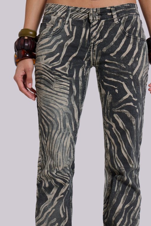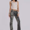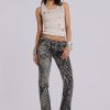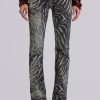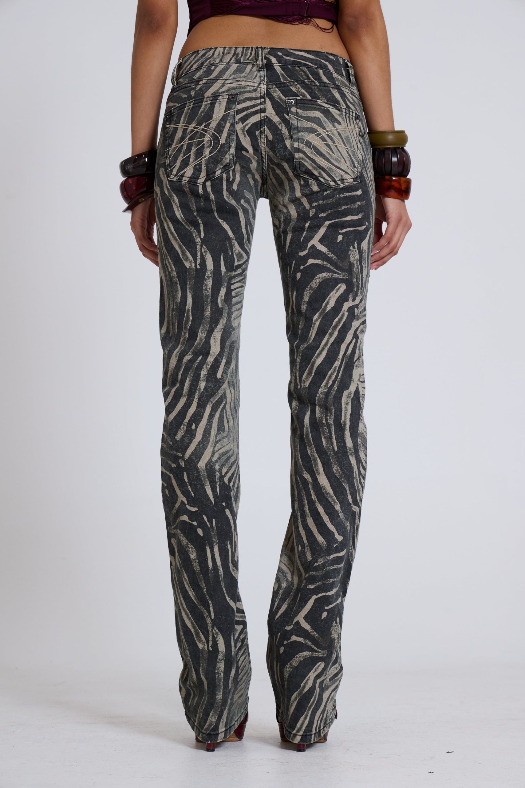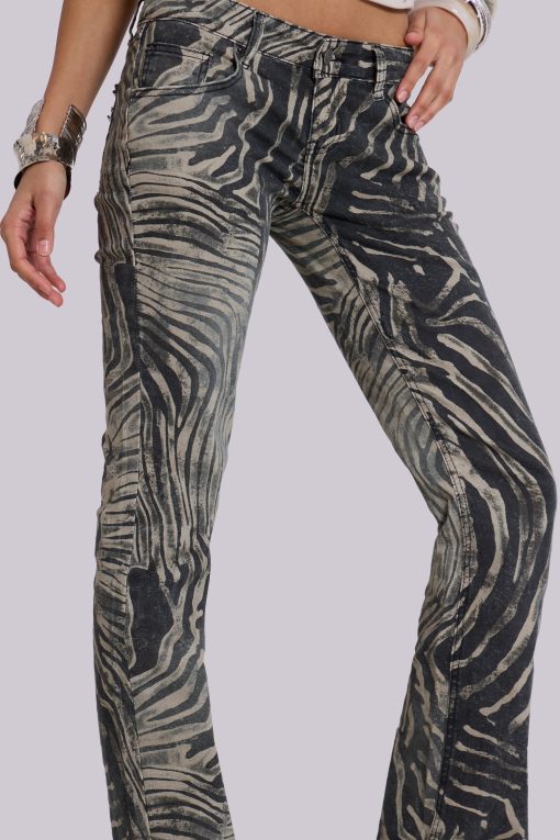 Low-rise stetch denim bootcut zebra print jeans with vintage wash and back pocket embroidery detail.