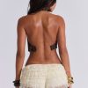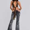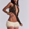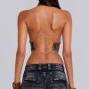 - Faux snakeskin neckline with faux suede back tie detail. Printed jersey high neck top with front knotted detail and back circular trim.