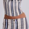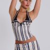 Navy, blue and cream Girlfriend satin halter neck corset in stripe pattern print with sailor-style satin lapel collar. Part of a co-ord.