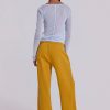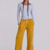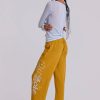 The cropped, cut off yellow joggers are crafted from a loopback fabric, with an elasticated draw cord waistband. They feature a printed slogan down left leg.