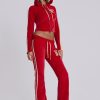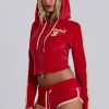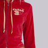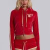 DescriptionThree Velour Fitted Hoodie. Vintage red sporty zip-through hoodie in soft-touch velour with cream applique sleeve stripes, drawcord and distressed embroidered logo detail.