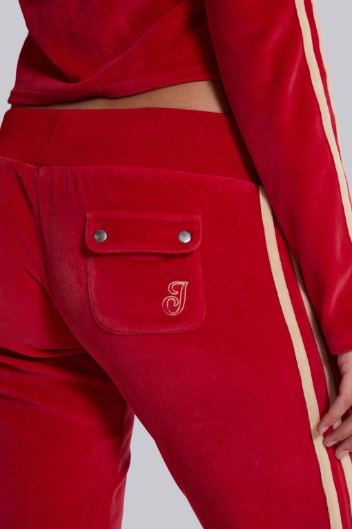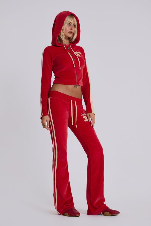 DescriptionThree Velour Low-rise Bootcut Trousers. Vintage red sporty low-rise bootcut trousers in soft-touch velour with a rib waistband, cream side stripes, drawcord and distressed embroidered logo detail.