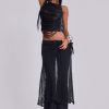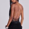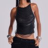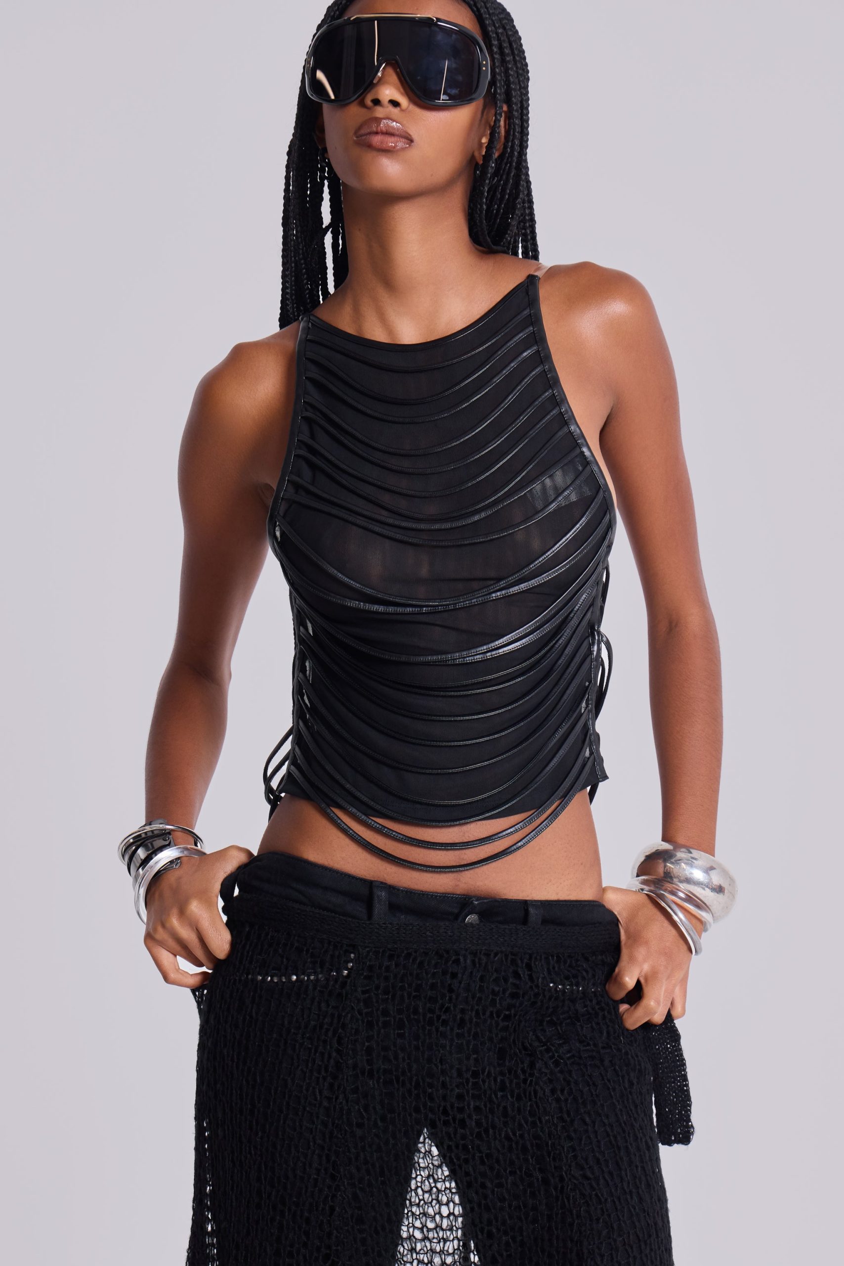 Strings Attached Backless Top. Backless black mesh top with PU faux leather strap detail. Features illusion clear invisible adjustable back straps.