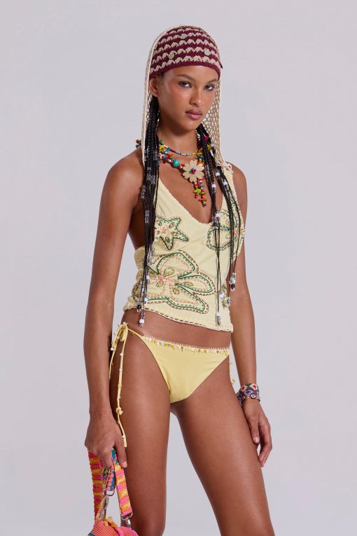 fabric: 90% polyester, 10% elastane. Trim 1: 100% natural shell. Trim 2: 100% copper, 100% glass