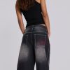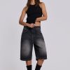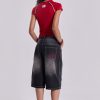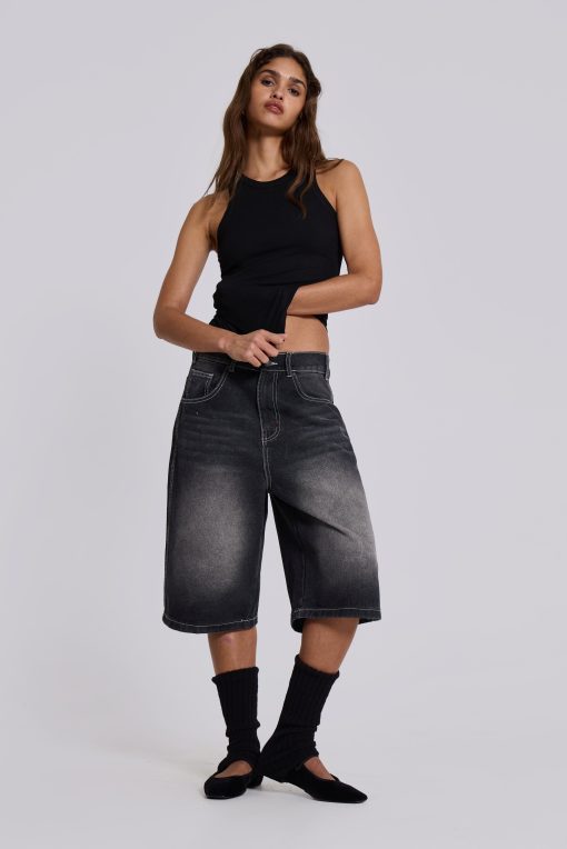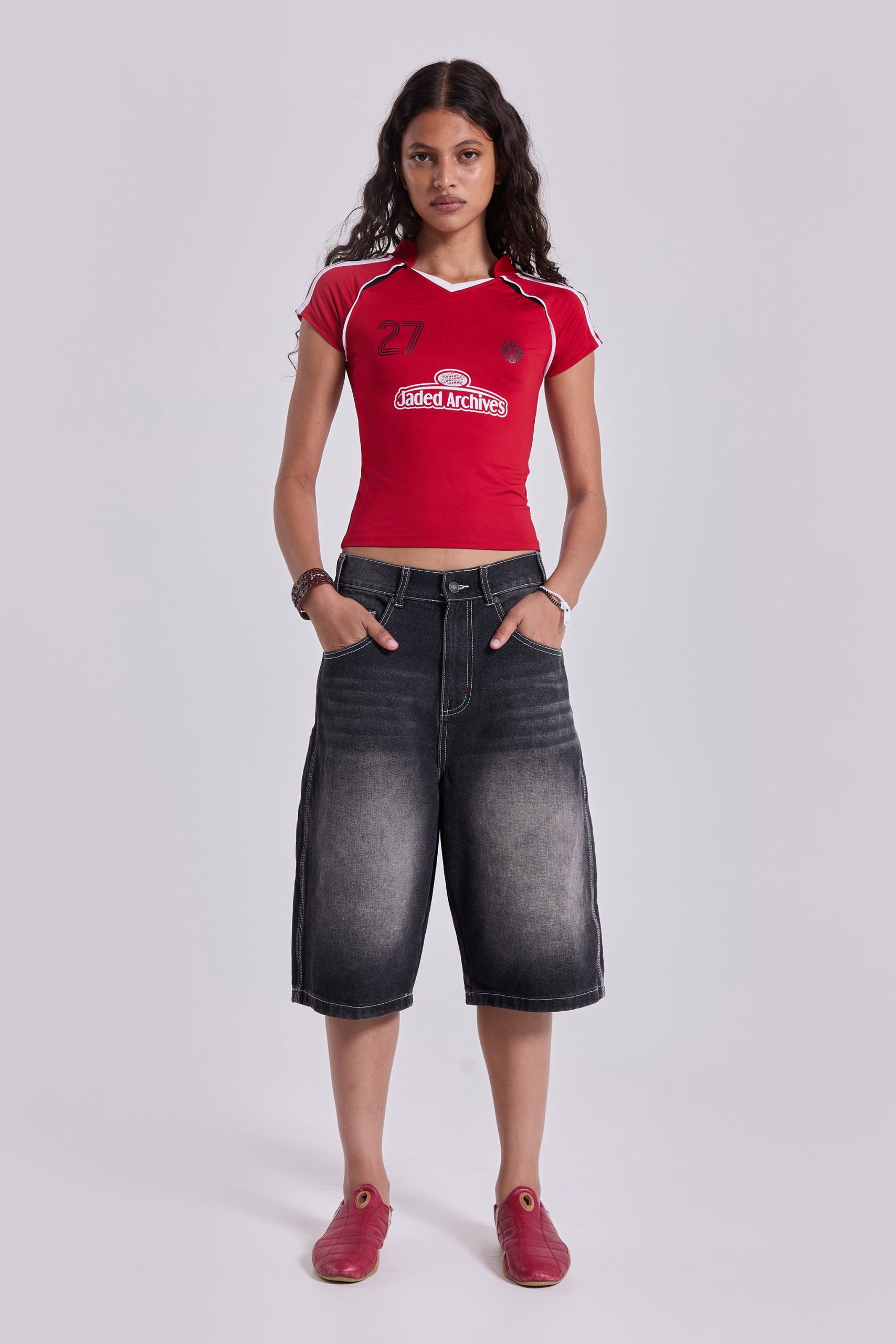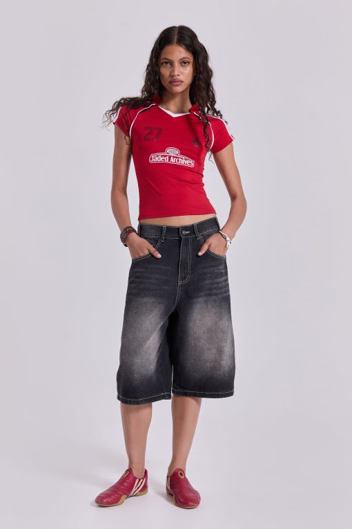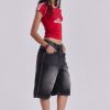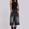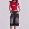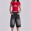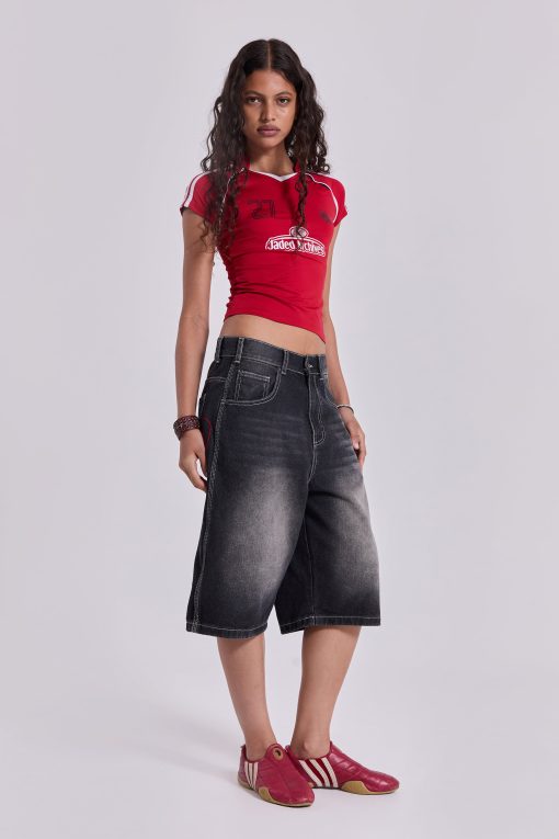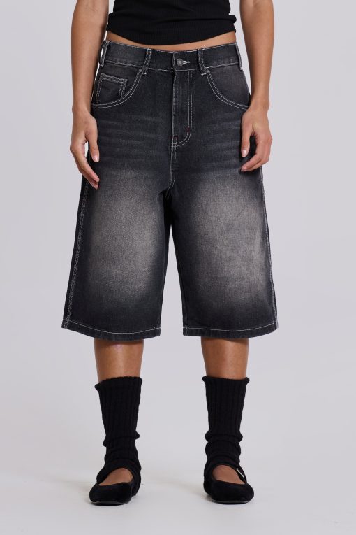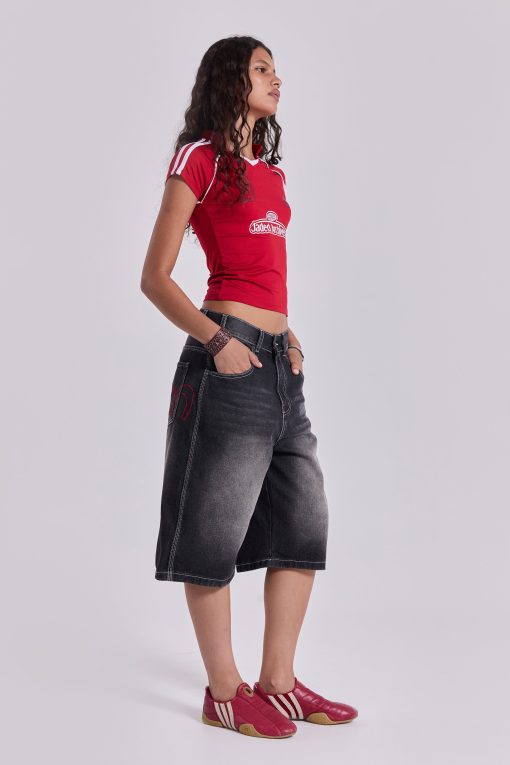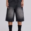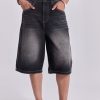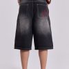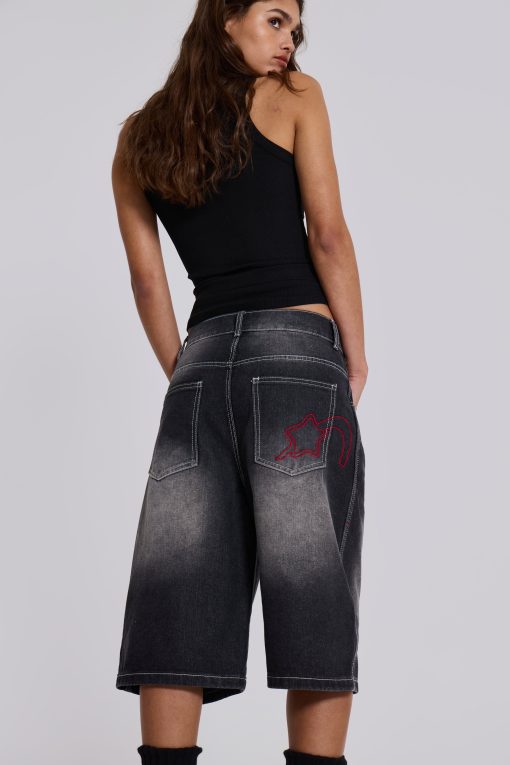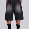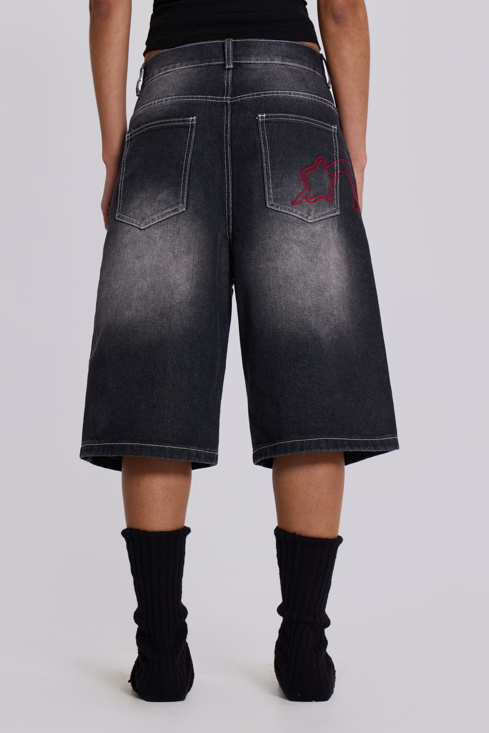 Introducing the Washed Black Jumbo Jorts “ crafted in a non-stretch washed black denim with a vintage wash, these jumbo fit jorts feature red star embroidery detail on the back, x5 pocket styling, belt loops at the waistband with antique silver metal rivets.
