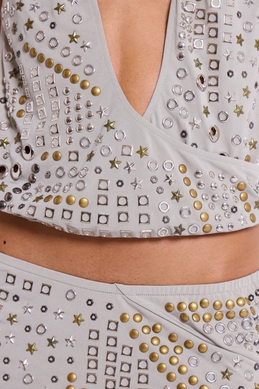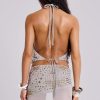 DescriptionXtal Studded Backless Plunge Top. Multi studded halterneck tie plunge top.