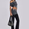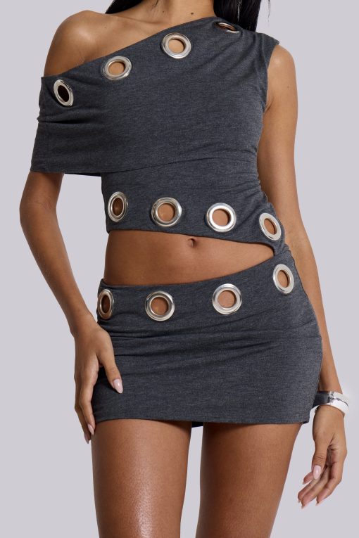 Zarco Asymmetric Mini Dress With Eyelets. Asymmetric dark grey marl jersey dress with oversized eyelets and a cut out hip shape. Dress is mini length with an asymmetric body shape.