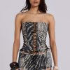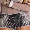 Lace up denim mini short with washed all over zebra print and frayed edges.
